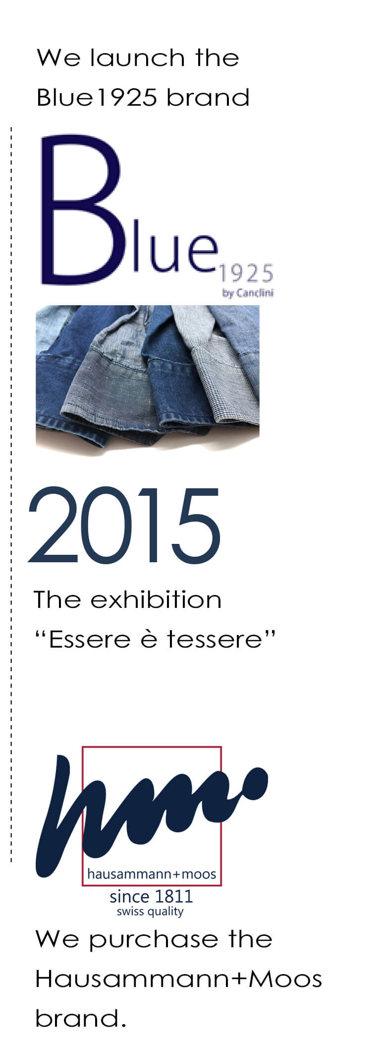 It was born as a leader of classic shirting fabrics for men and today it is considered a global player of fabrics, thanks to the variety of brands which are part of the group: Canclini1925, Blue1925, Hausammann+Moos1811, Profilo Tessile, Grandi & Rubinelli, Olimpia and Mida1975.